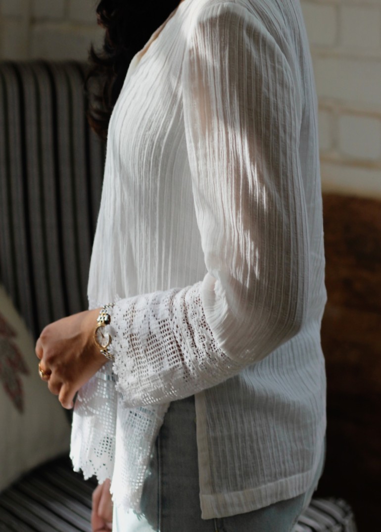 V neck blouse with wrapped with lace on the sleeve hem and body hem